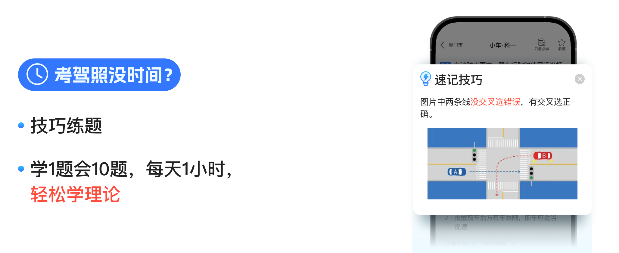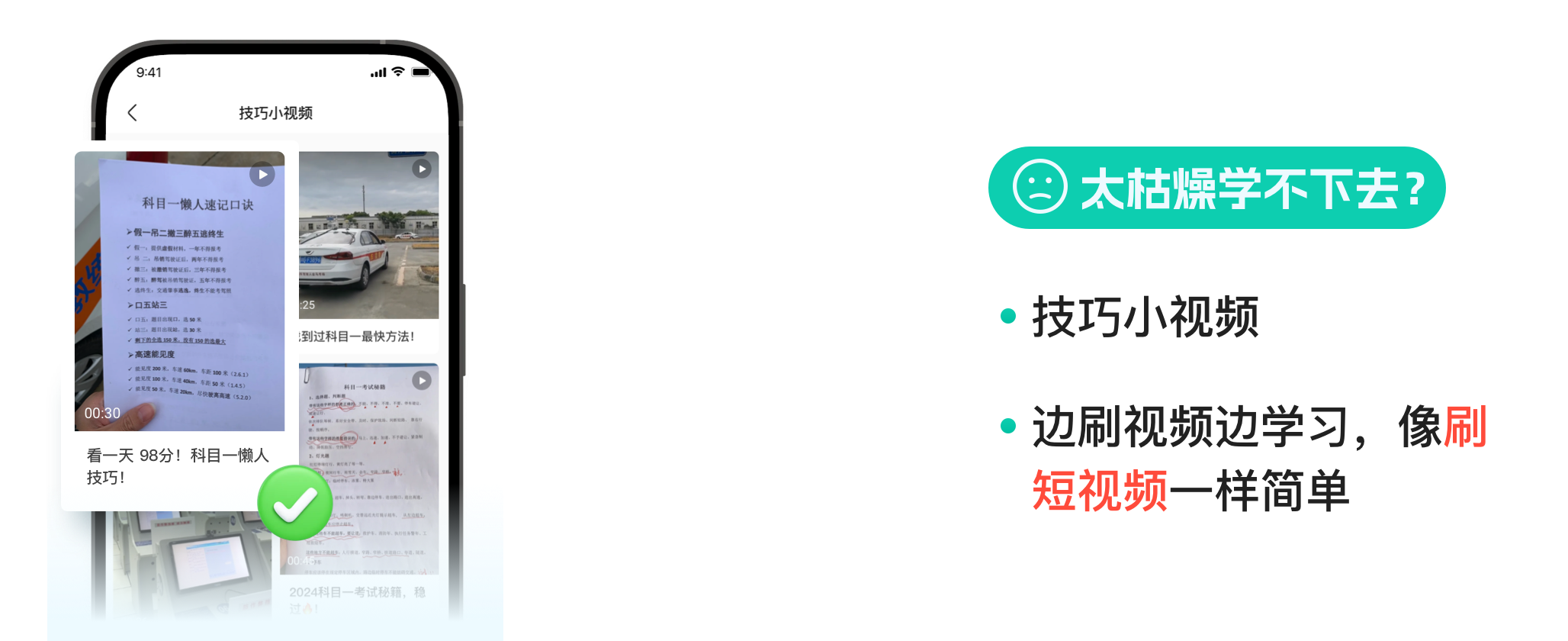 《简易驾考》是一款简单学习,轻松考试的驾考理论学习APP,为想要考驾照又总是没时问、记不住、考不过的朋友提供技巧练习,在线讲解等方式快速学习题目重点; 同时还提供技巧小视频以有趣的视频语音讲解让你轻松记住答题方法,像刷短视频一样,边刷视频边学习,轻轻松松记住题目答案。